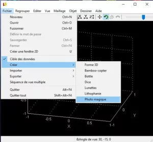 On ouvre donc Luban3D et on clique sur « Fichier » en haut à gauche puis sur « Créer » et en suite sur « Photo Magique ».